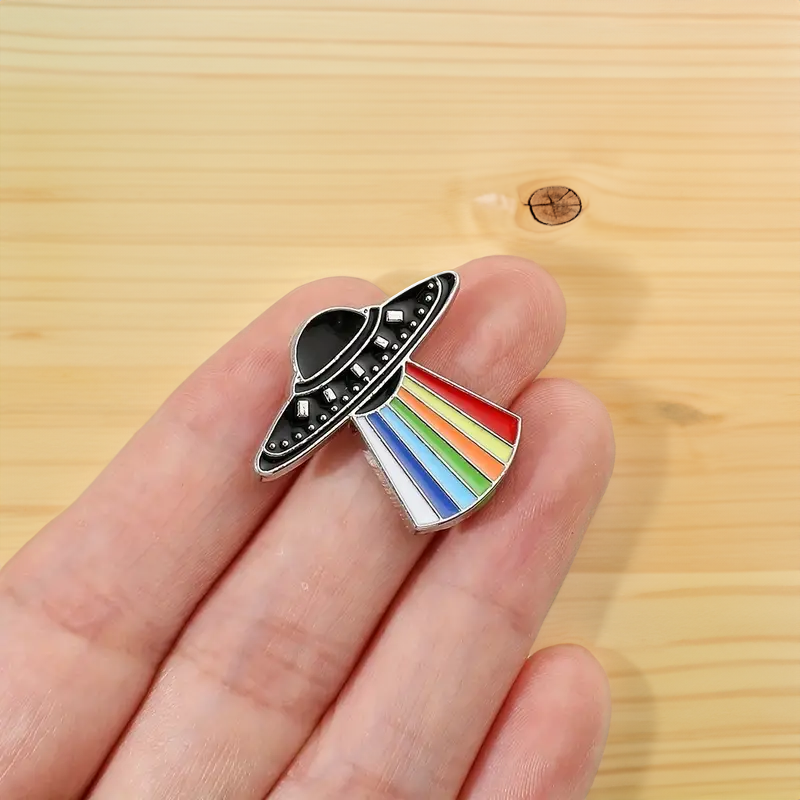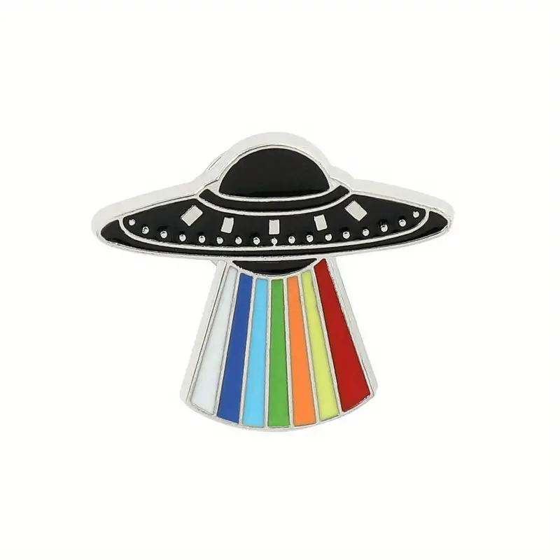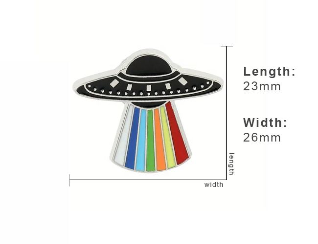 Embark on an intergalactic adventure with our mesmerizing Alien UFO Rainbow Spaceship Enamel Pin! Pin it to your jacket, backpack, or hat for an instant style upgrade. Express your love for all things cosmic and mysterious. Surprise a fellow stargazer, sci-fi lover, or UFO enthusiast. It’s the perfect addition to any pin collection.