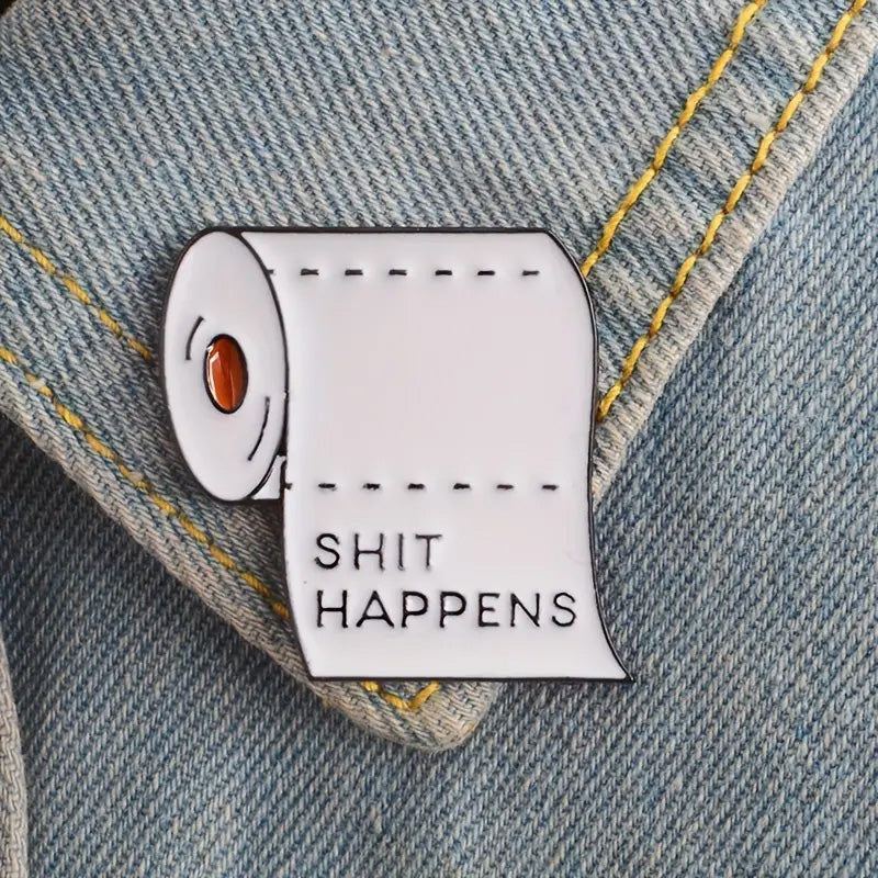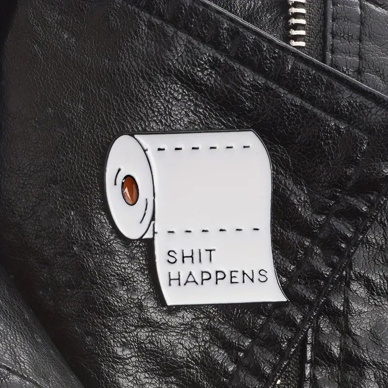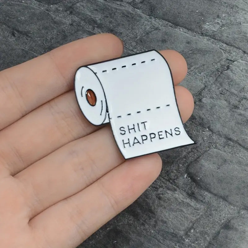 This quirky enamel pin features a humorous twist on everyday life. The design playfully combines a toilet paper roll with the phrase “Shit Happens”. It’s a fun accessory that adds a touch of irreverence to your outfit or bag. Whether you’re a fan of witty pins or simply appreciate a good laugh, this one is sure to make a statement!