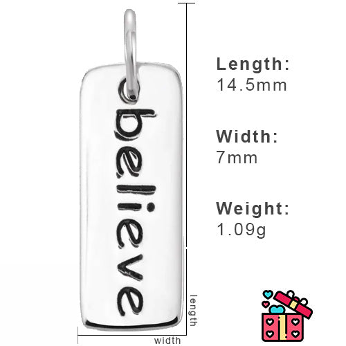 This Small Sterling Silver "Believe" Tag Charm is a beautiful piece of jewelry that carries a powerful message. Crafted from 925 sterling silver, this charm is designed to last and maintain its shine over time. The charm features the inspirational word "Believe" deeply engraved into it, serving as a constant reminder to hold onto your beliefs and dreams. The compact size of the charm makes it a subtle yet meaningful addition to any jewelry piece. The charm can be easily added to a bracelet or necklace, making it a versatile piece that can be personalized to your style. Its timeless design makes it a perfect gift for graduations, birthdays, or any occasion where a little encouragement can make a big difference. Whether you're buying it for yourself or as a gift, this Small Sterling Silver "Believe" Tag Charm is more than just a piece of jewelry - it's a token of faith, strength, and personal power.