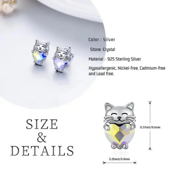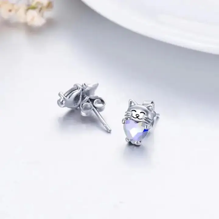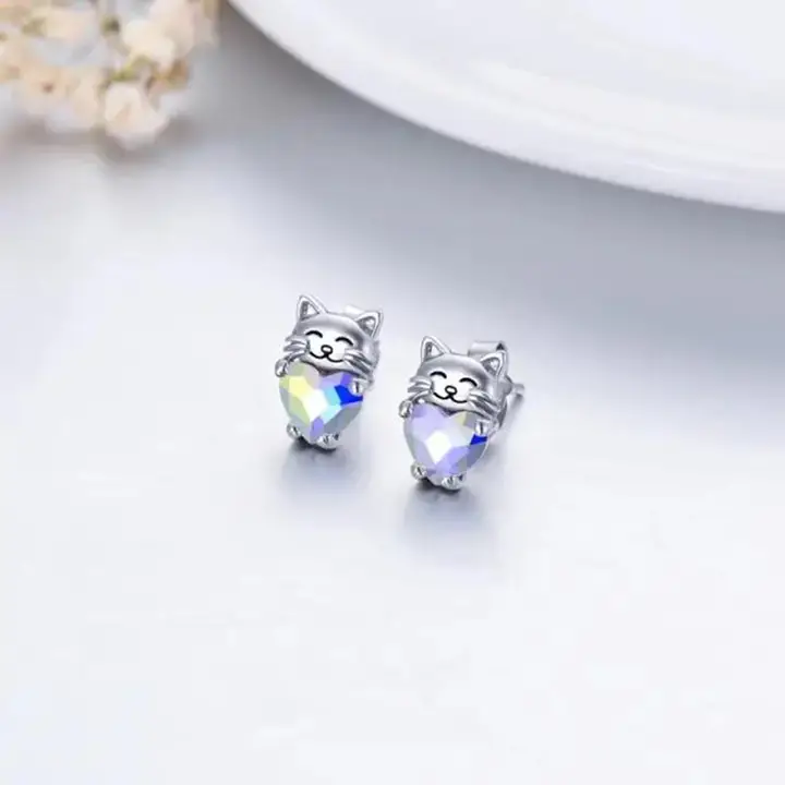 These small pretty cat earrings feature a 925 silver cat hugging a crystal heart. These cat earrings are purr-fect for any occasion. You can dress up or dress in denim and these cute cat earrings will add just the right shine. These are small earrings